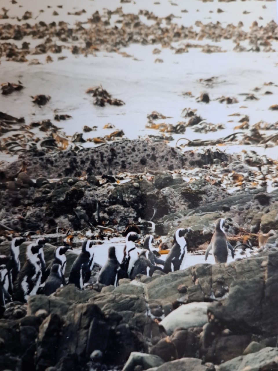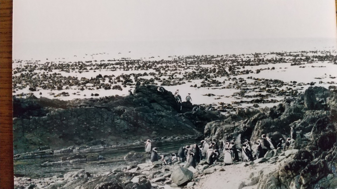 ※写真は2枚とも「ロベン島のケープペンギン」、1994年8月撮影。岸辺近くには、ジャイアントケルプが繁茂しています。岩場が黒いのは「漂着した重油」が染み込んでしまったため。この年、「ケープペンギンの総個体数」は16~17万羽と言われていました。