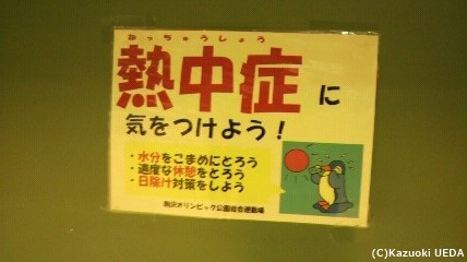 体育館中央に面した鉄製扉に貼ってありました(^○^)!!屋内なのにお日様が照っているとか、堅いフリッパーでどうやってコップを持つんだとか、突っ込みどころ満載ですが…、まあ、これは体育館だけでなく「駒沢綜合運動場」全体に掲示されている「注意書」ですから、やむを得ないでしょう(~_~;)!?