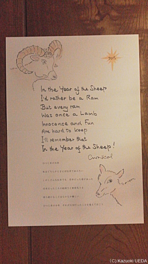 もう1枚の「羊の新年カード」は、「C.W.ニコル・アファンの森財団」のN様からいただきました!!N様、素晴らしいカードとニコルさんのメッセージを、本当にありがとうございました_(._.)_!!新しい年が、日本の豊かな森とヒツジとペンギンたちにとって、幸せな1年となりますよう、私も力を尽くしたいと決意しております。