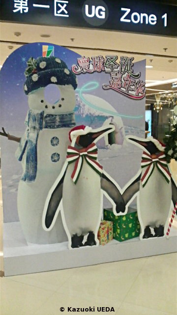 北京を代表する繁華街、「今やニューヨークを抜いた!」と中国人が豪語する、目玉中の目玉、王府井(ワンフーチン)の大ショッピングモールには、華やかなクリスマス飾りが目立った。そのメインの1つがこれ!「ペンギンとのツーショットコーナー」や「ペンギンバナー」だ。