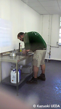 次は、いわゆる「調餌室」。日本でもよくあるが、冷凍庫を含む管理棟の一部がガラス張りになっている。流しで「餌の魚を解凍しているところ」を見学できるしくみ。餌は、主にイワシやタラだそうだ。